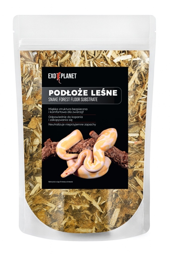 EXO PLANET Snake Forest Floor Substrate to wysokiej jakości, w pełni naturalne podłoże do terrarium, stworzone z mieszanki kory i włókien cyprysowych oraz drobno ciętego chipsa kokosowego. Doskonale sprawdza się w środowiskach o podwyższonej wilgotności. Jest przeznaczone przede wszystkim dla węży.