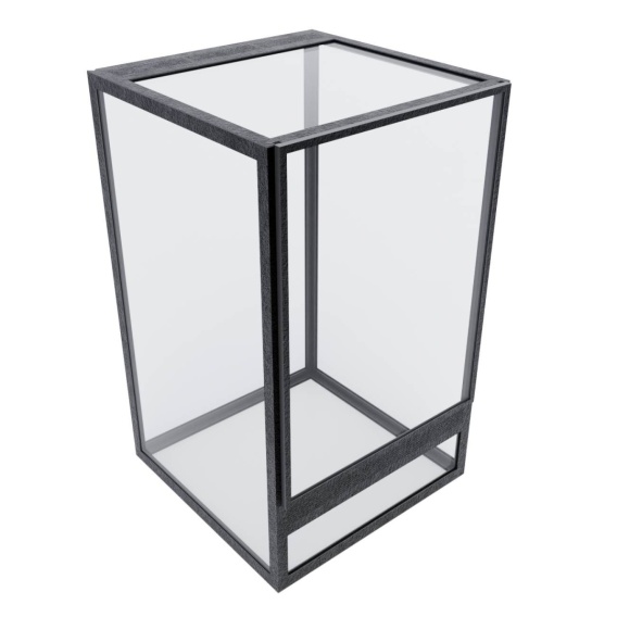 Terrarium wyposażone jest w funkcjonalne drzwiczki wsuwane w prowadnice, co umożliwia szybki i wygodny dostęp do wnętrza. Ramka z druku 3D oraz szybka 2 mm zapewniają stabilność i bezpieczeństwo użytkowania. Rozwiązanie to jest często stosowane w terrarystyce do obsługi niewielkich egzotycznych gatunków i znacznie ułatwia codzienną pielęgnację.